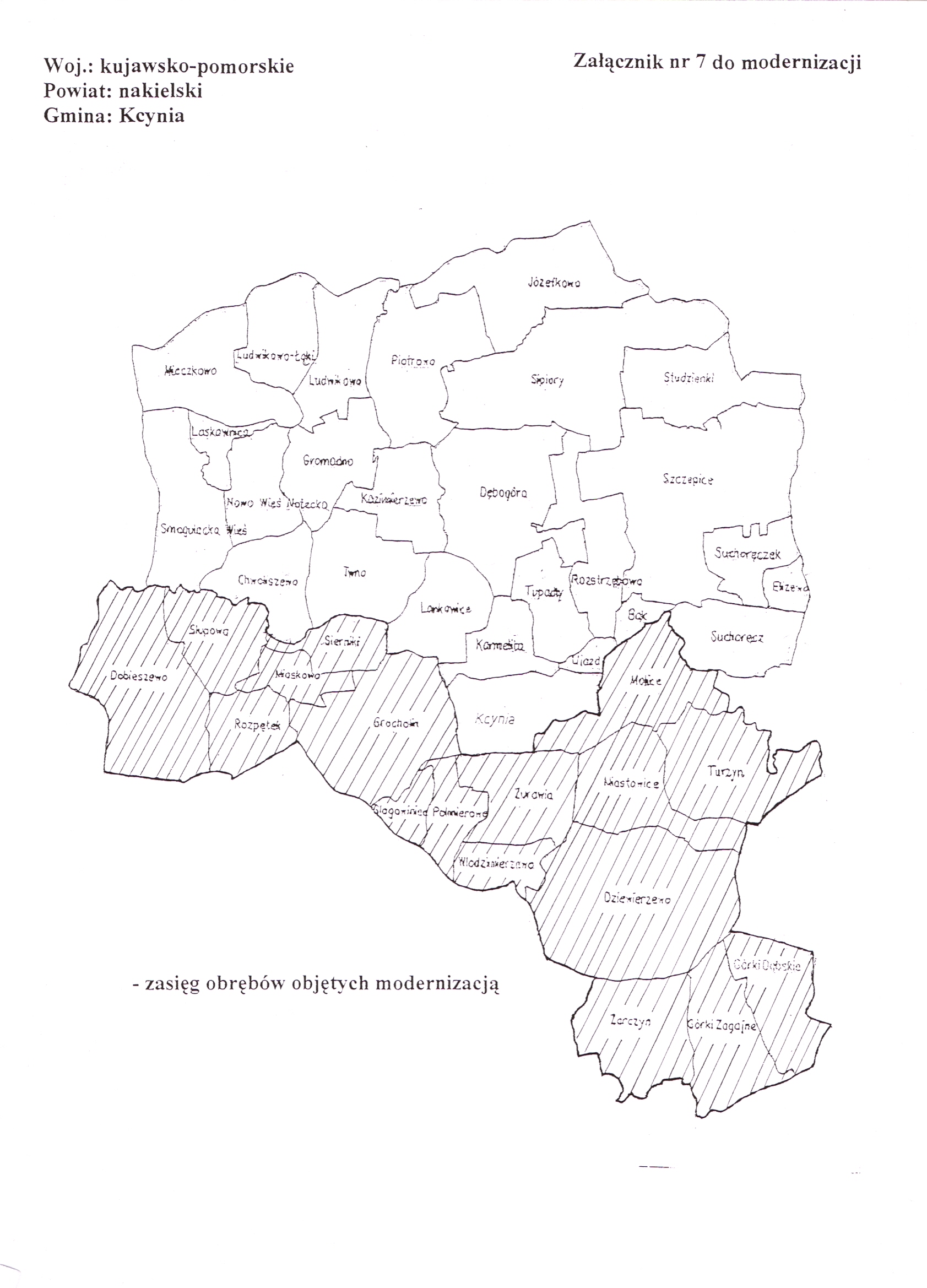 wykonanie modernizacji ewidencji gruntów – założenie ewidencji budynków i lokali dla 17 obrębów gminy Kcynia, aktualizacji wektorowej mapy ewidencyjnej terenów wiejskich powiatu nakielskiego w systemie TurboEWID w zakresie budynków, użytków gruntowych i konturów klasyfikacyjnych oraz korekty granic działek |